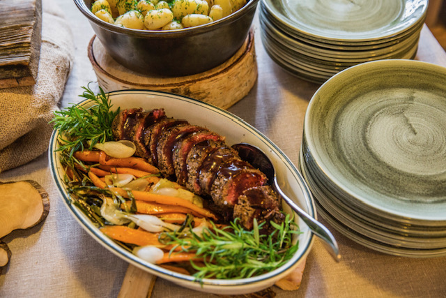 Eri vuodenajat näkyvät keittiössämme. Sadonkorjuun aikaan haemme kasvikset suoraan pellosta, sienet ja marjat metsästä, sekä käytämme villiyrttejä sesonkien mukaan. Ruisleivänkin leivomme itse 100 % luomurukiista yli sata vuotta vanhaan juureen.
